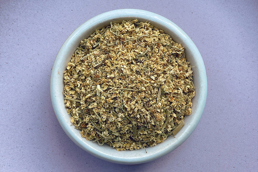 Light and floral with a pleasant funk, these dried elderflowers have been rubbed on mesh screens to crumble them slightly. In addition to being used as a tea, elderflowers have found widespread use in making infusions, cordials, and wines.